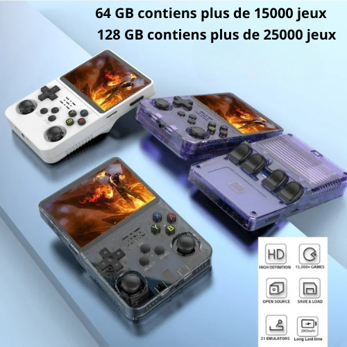 La console est préchargée avec plus de 15 000 jeux classiques issus des plus grandes consoles rétro (NES, SNES, Game Boy, Mega Drive, etc.). Vous y retrouverez des titres cultes comme Mario, Pokémon, Sonic, GTA et bien d’autres.